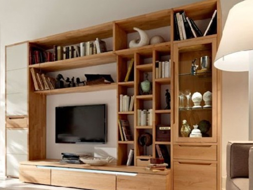 两种收纳形式相结合,带有挡板的封闭部分用以存放细碎杂物,便不会显得房间凌乱。要说正面收纳型电视背景墙的亮点,则是电视机面前两扇可自由移动的“小门”。日常不用的时候,聚合起来,电视背景墙就是一个完整的书架,想看电视拉开来,又是一个收纳功能强大的木质电视背景墙!