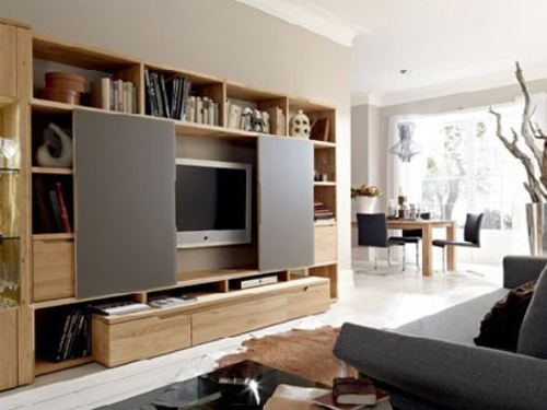 兼具电视柜、储物柜和装饰墙功能的背景墙可谓一件多用,你也可按照自己家庭的客厅面积和个性生活需求,选择相应的组件合成这样多功能的柜体。电视两侧,一边是开放式的储物设计,用以书本等小物件的收储和展示功能的满足;另外一侧则是全封闭式的储物设计,满足各种收纳需求。