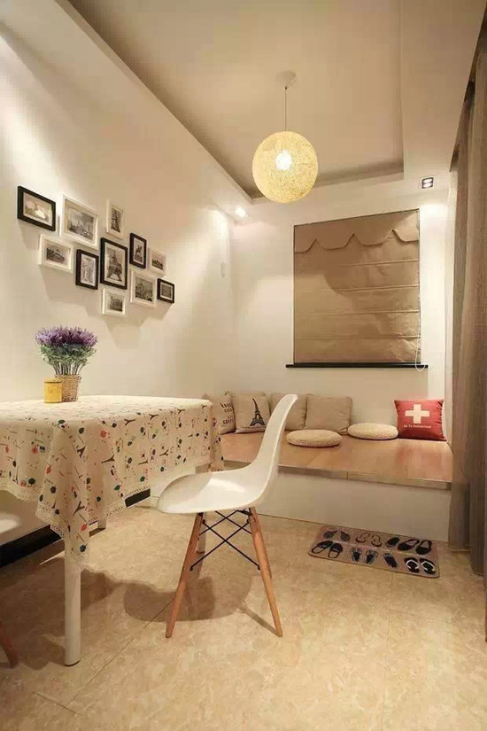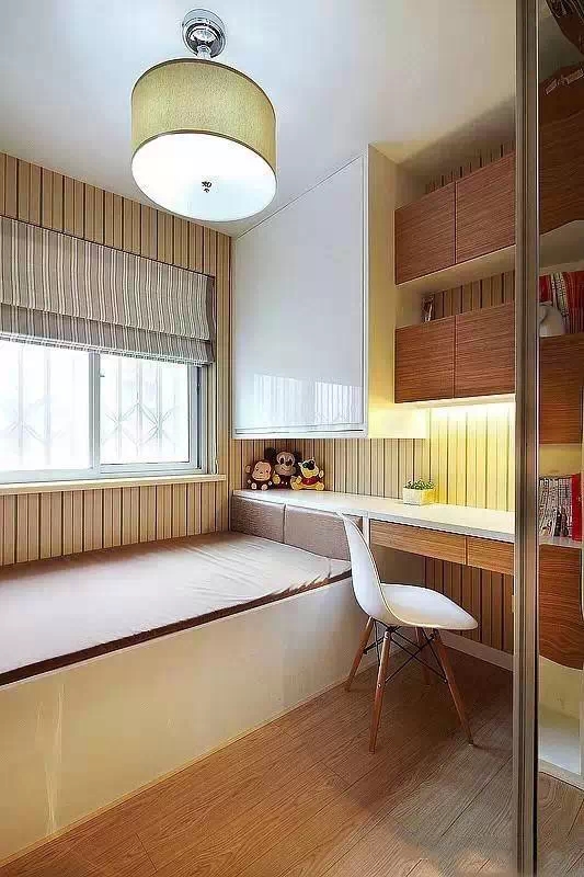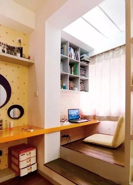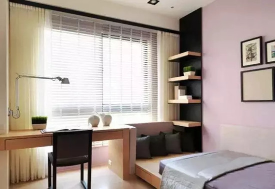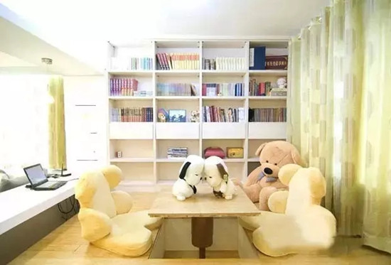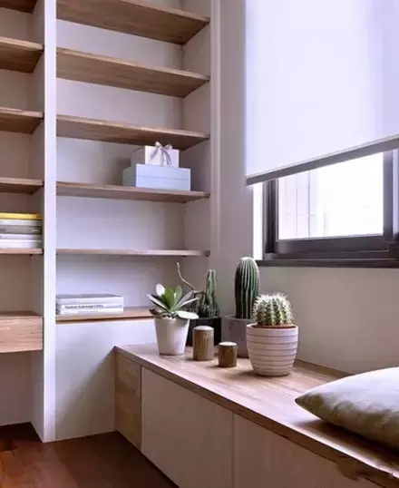 小户型最需要动脑筋的地方就是收纳空间的设计,而榻榻米则可以解决这个问题。地台下可以设计成几个超大容量的抽屉,换季衣物、家庭杂物、儿童玩具均可隐匿无踪,让家居空间更加简洁有序。而贴合墙面的榻榻米还可以在墙壁上装上几个置物架,就是一个小小的书柜,也能体现装饰作用,平时喜欢的小玩意尽可以放置在上。