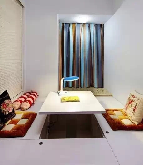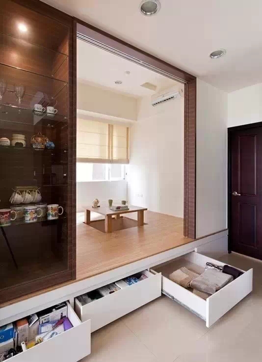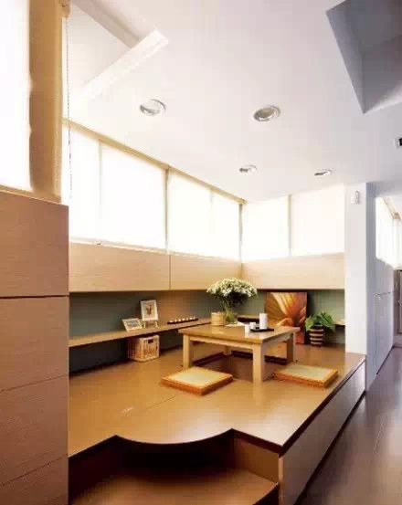 升降台是榻榻米中一个非常实用的创意,放上两个座椅,就可以在这里享受休闲时光。榻榻米中间可以设计成随意升降的小台,升起之后就是一个简单的小桌,可以用来品茶、阅读,沉降之后与榻榻米表面齐平,放上床品,拉下隔断的帘子,就是一个小小的临时卧室。