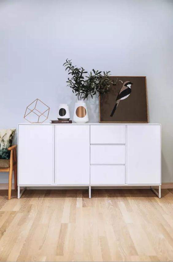 柜子上带有黄铜元素的各种摆设,瞬间将这个家的格调提升不少。浅色木地板的大面积铺设,让人在自然氛围中得到安乐与满足。