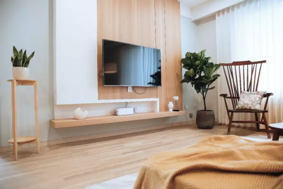 别具一格的电视背景墙,延续了整个舒适自然的空间格调;阳光从窗帘中透射进来,营造出一种温暖惬意的感觉。