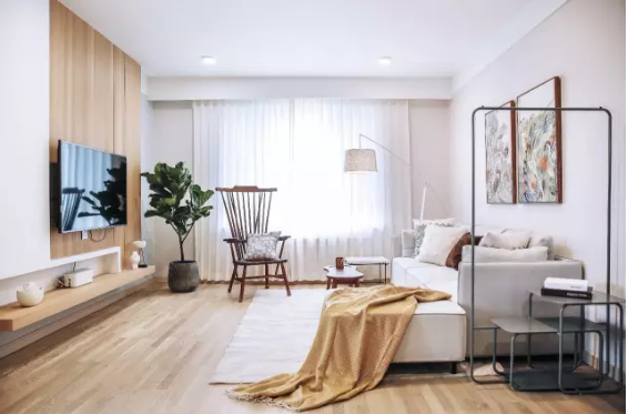 客厅通过白色与木色来提亮空间,搭配简约而别致的功能性家具,整体看上去淡雅、柔和,带来一种宁静的感觉。