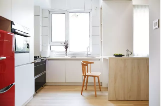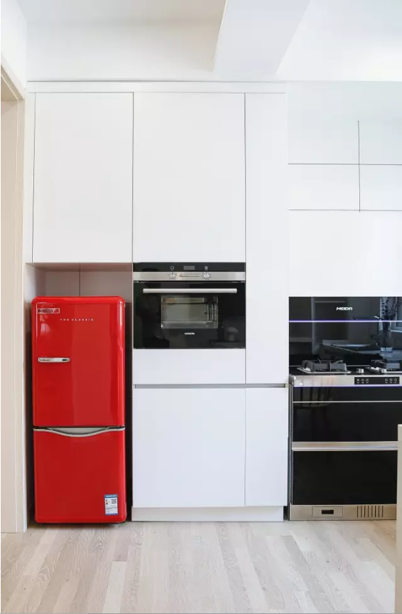 整体橱柜与纯白的整体空间融为一体,简约而有品位,红色冰箱采用了内嵌式设计,为视觉带来强大的冲击力。
