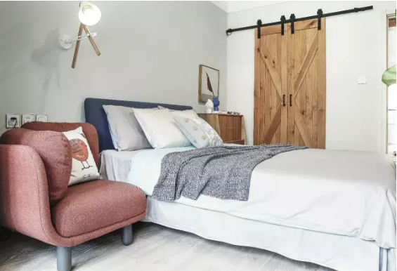 谷仓门里面藏了一个嵌入式衣柜,足以满足业主强大的收纳需求,门一关上也不会影响卧室的视觉感,反而让这扇门成了一件不错的装饰。