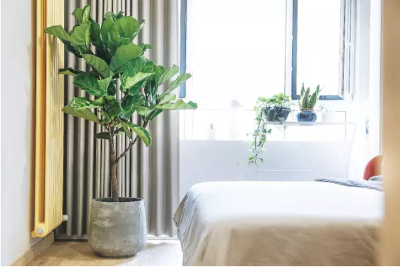 窗台旁与床尾都摆放了绿色植物,清新自然,令人倍感舒畅。