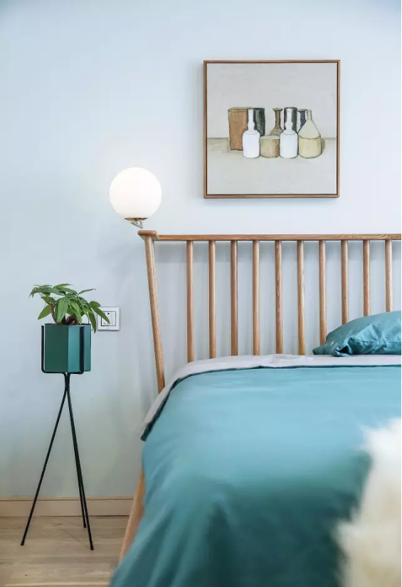 取消床头柜设计,用被支架撑起的小盆绿植来装饰空间,别致而有特色。