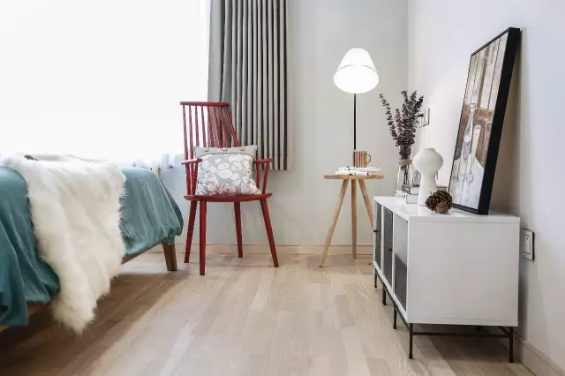 床尾靠墙的一个角落也被充分利用起来,一张小边几,一把椅子,一盏台灯,一个抱枕,无需多么复杂的配置,也能围合成一个安静舒适的阅读区。