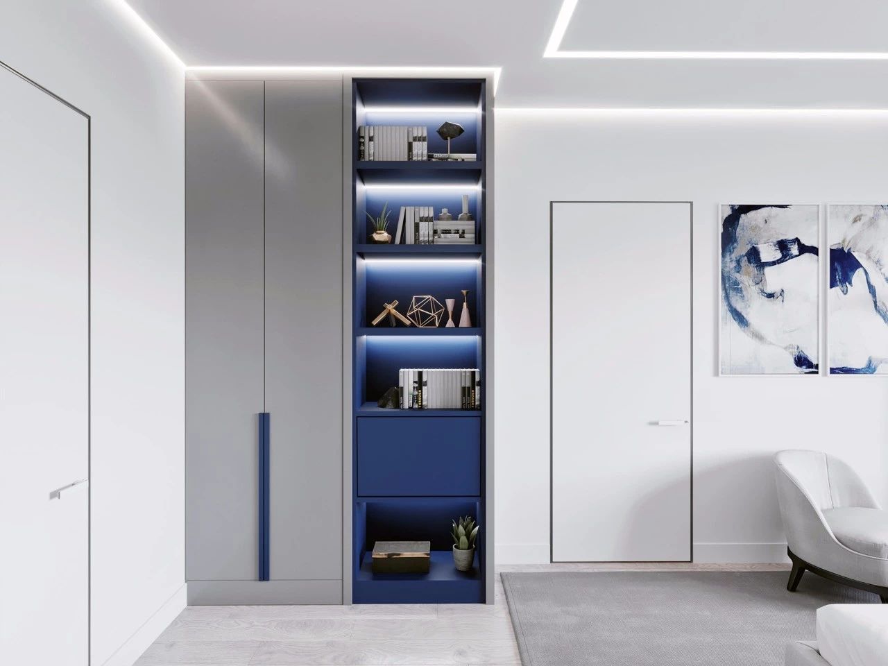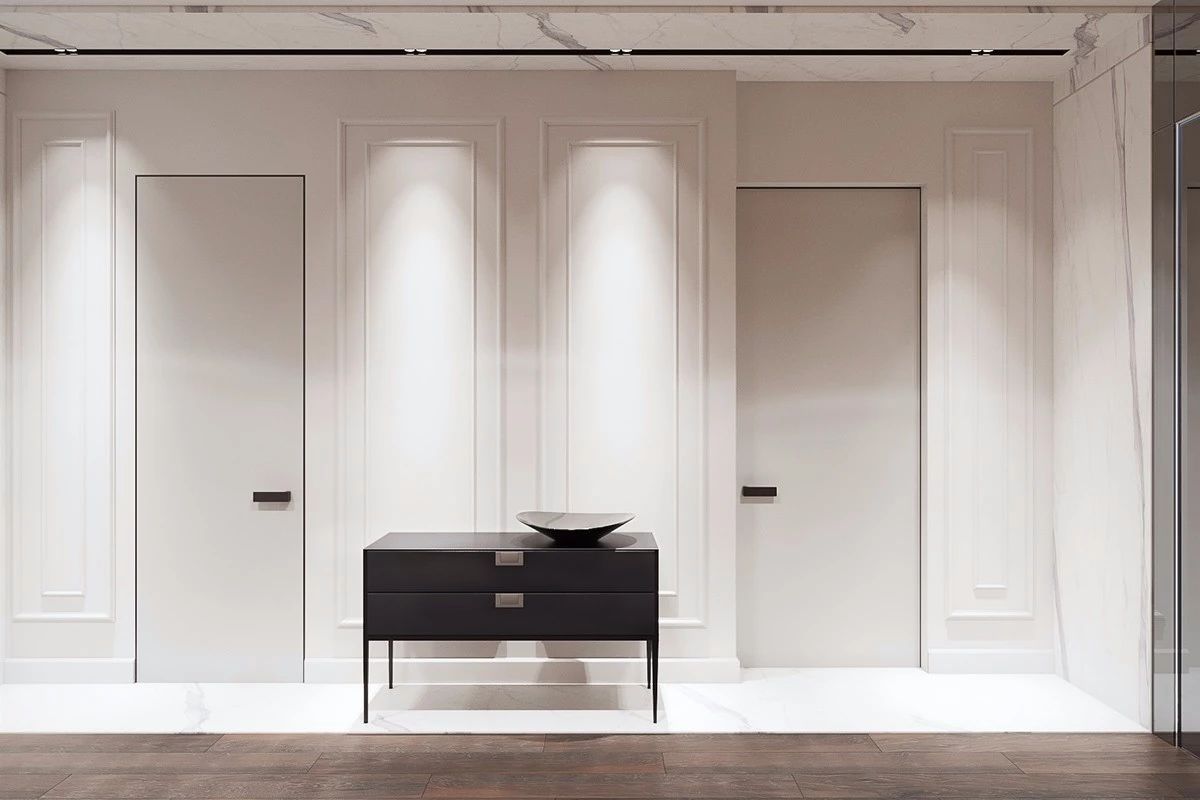 在大面积的白色基调中,极简设计以功能性为原则,更加注重细节及比例的协调。它是以大量留白为底色,再加入些许富有肌理感的现代材质(如大理石、清水混凝土、金属等),配合着恰到好处的灯光渲染,极力塑造一种浑然天成的简约之美。