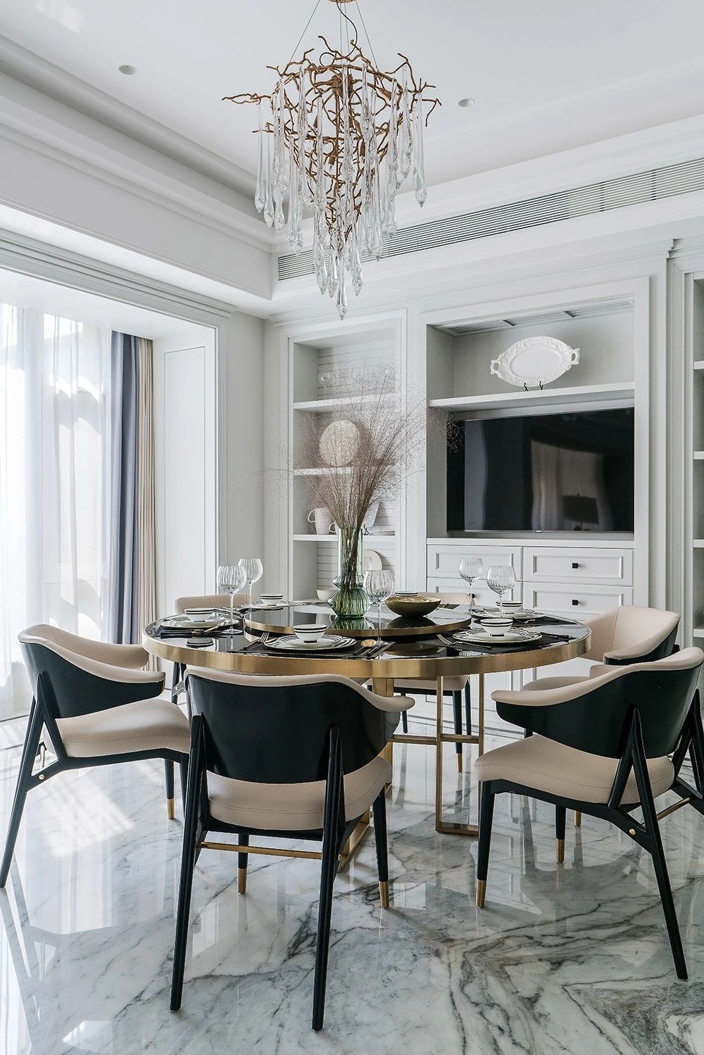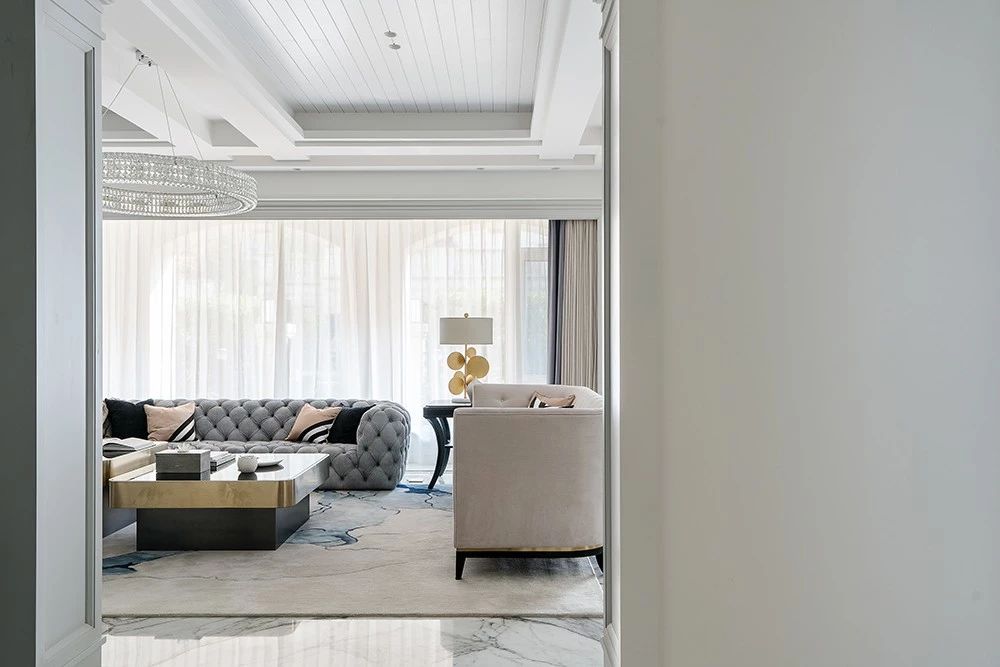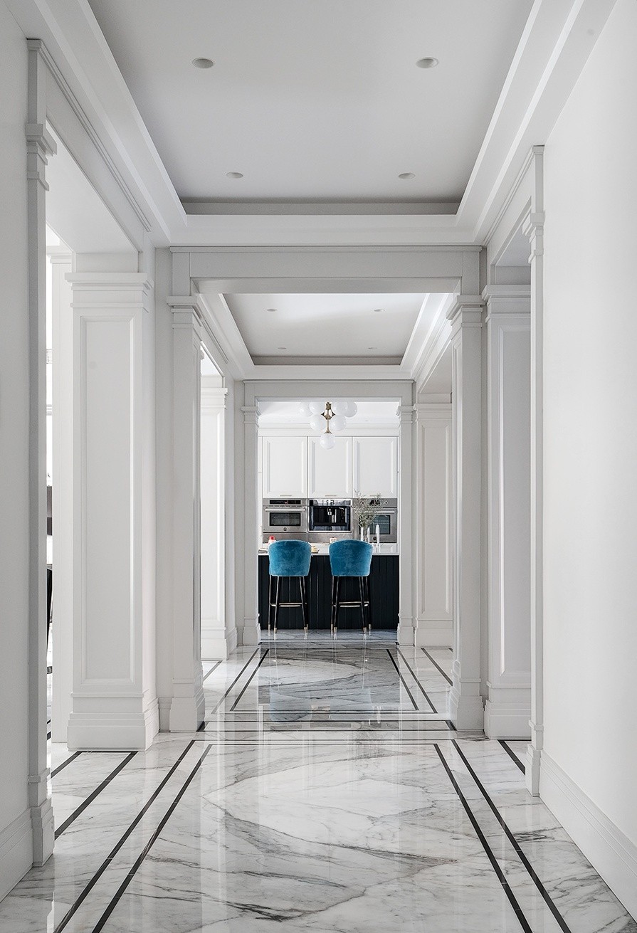 设计师通过大面积落地窗,将光线引入室内,配合纯白的色彩基底,光泽的大理石材质,使室内光线充盈,肌理细腻。