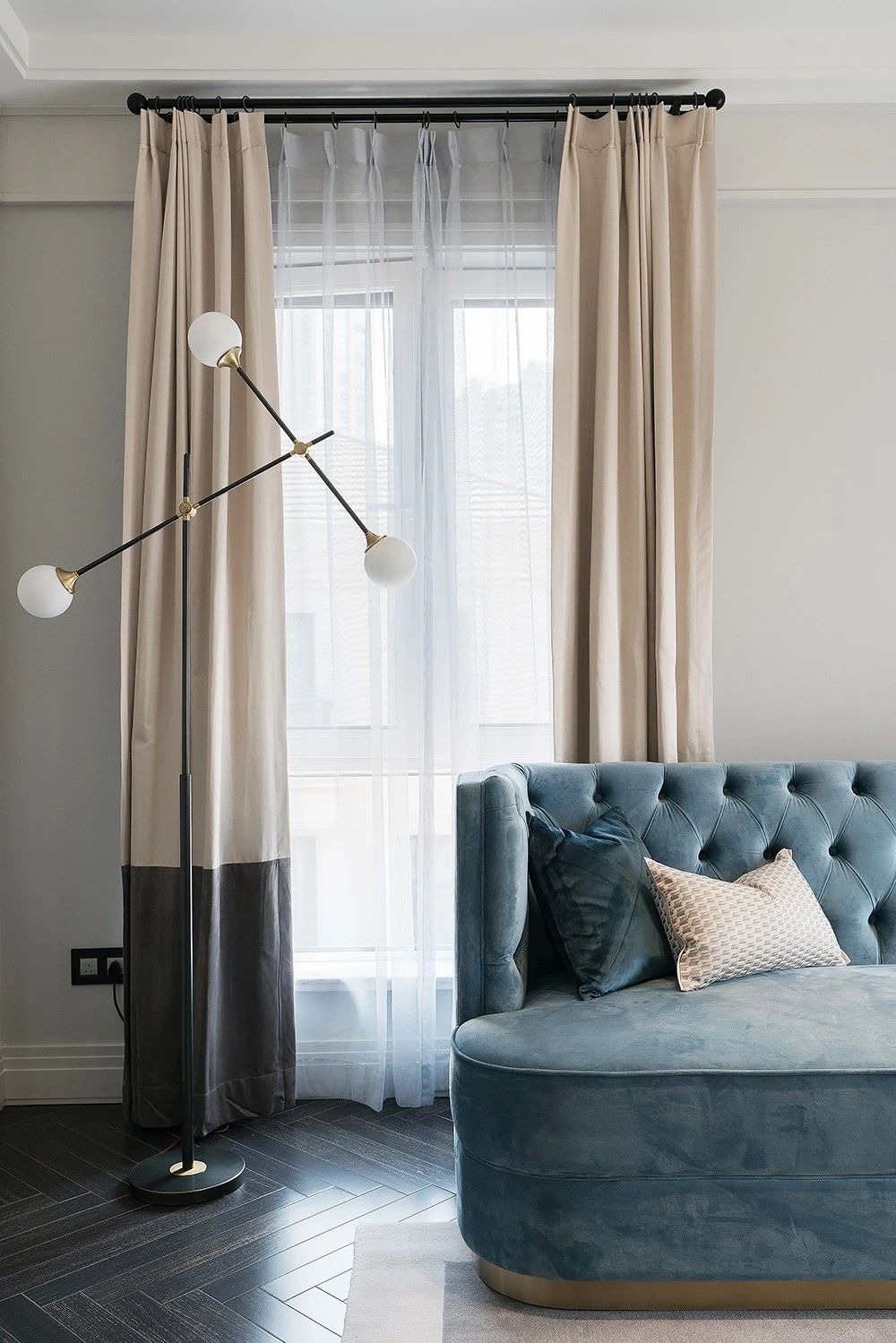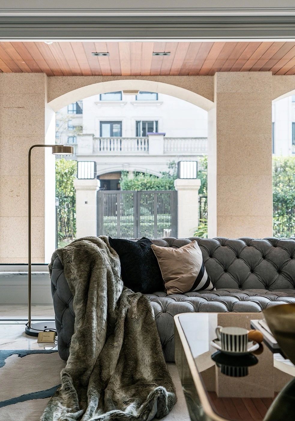 用温柔的浅褐色为主,佐以沉静的蓝。柔软的绒面沙发与来自窗外的光,勾勒出一副岁月静好的画。