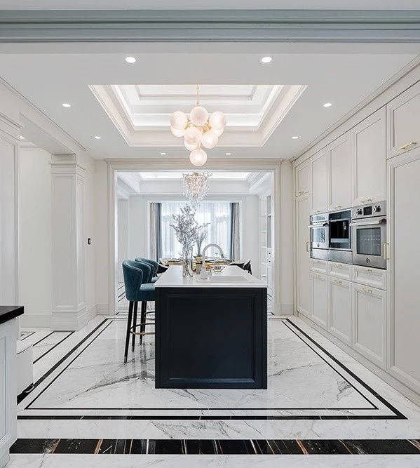 光泽的大理石地面一直延伸至厨房、餐厅,赋予空间整体感,与客厅所不同的,是增加了小部分的色彩点缀,因为厨房是属于家人的温馨,需要更多一些的元素来表达空间情感。