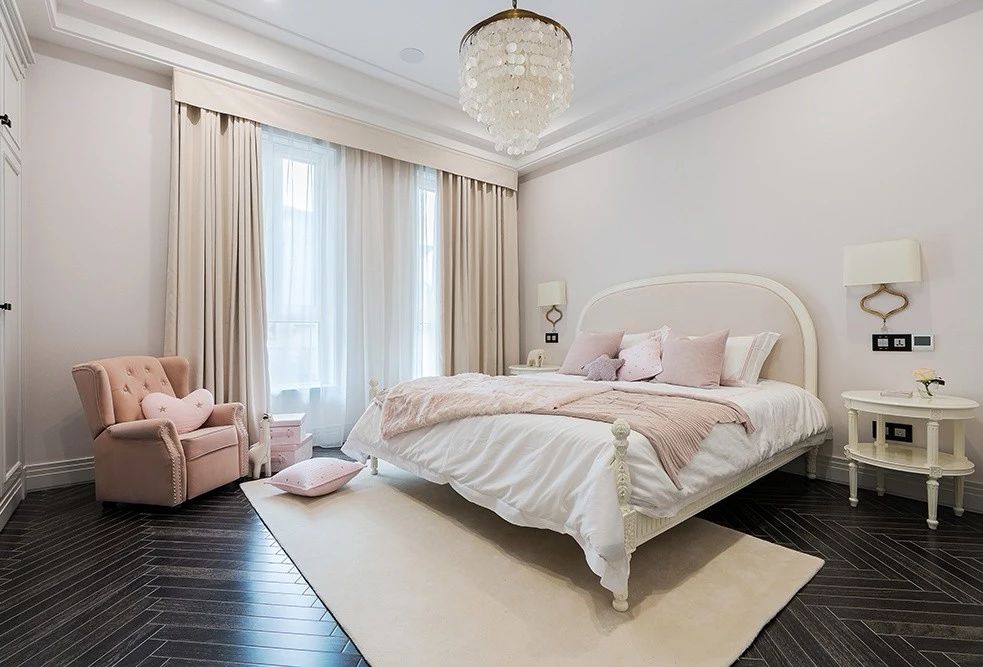 迎合整个空间的低饱和度色,女儿房选用了清浅的藕粉色作为主色调,配合黑胡桃的实木地板,在俏皮中多了一份沉稳,温柔中多了一分笃定。