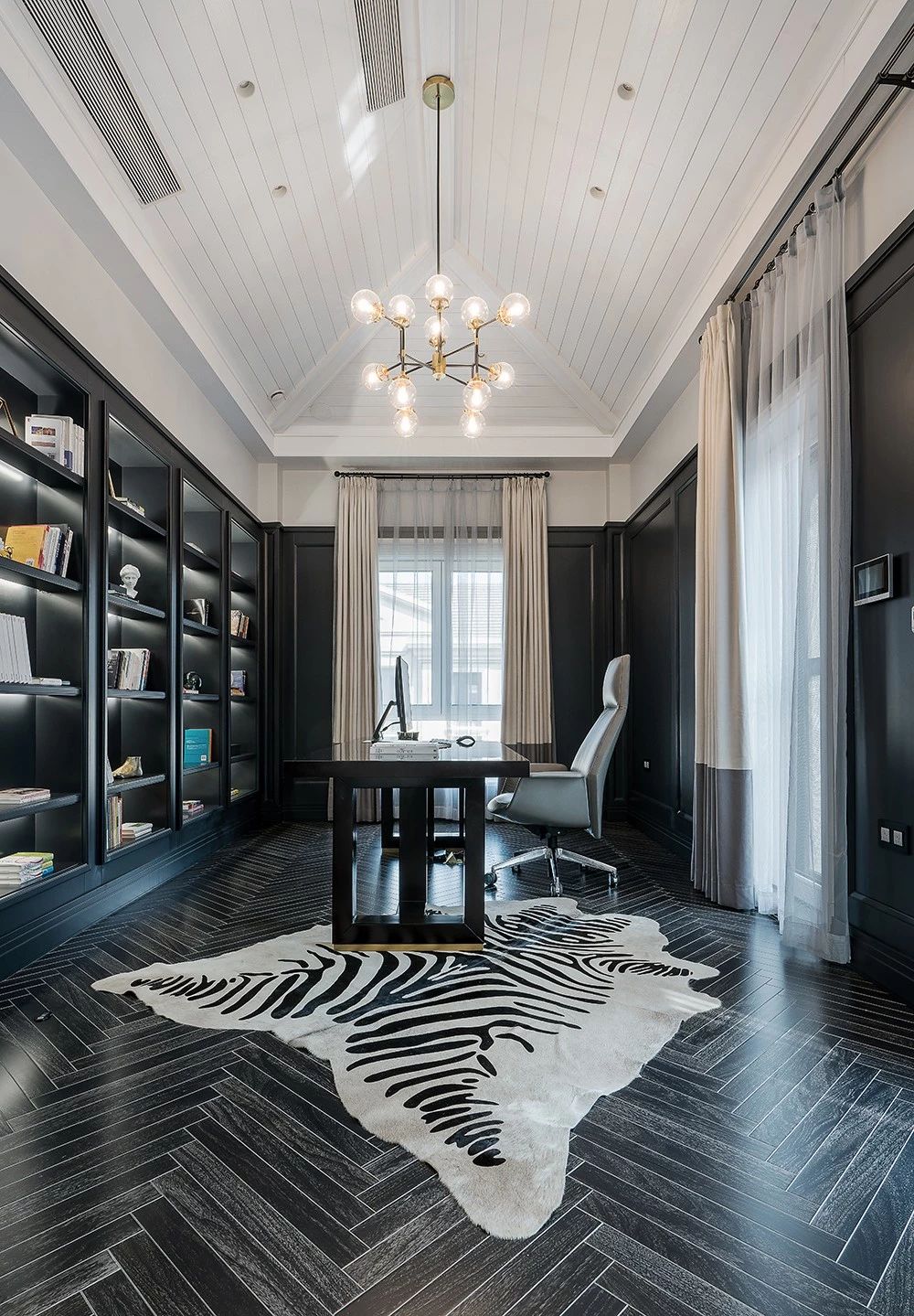顶层的书房,选择黑色为主的色调,更加沉稳大气,富有内涵。